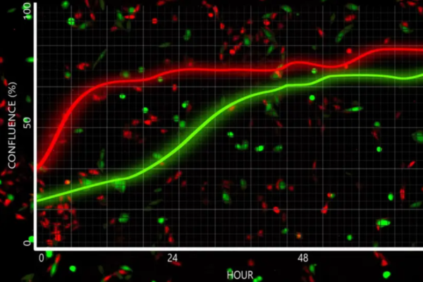 Brightfield a fluorescenční snímání v zelené a červené oblasti, kvantifikaci fluorescence: konfluence, počítání fluorescenčních objektů apod.