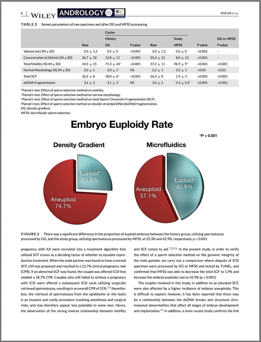 Všechny ženy měly negativní (normální) vyšetření plodnosti a všichni muži měli normální spermiogram. U 57 párů bylo provedeno 71 cyklů ICSI/PGT-A, při nichž byla použita selekce spermií DGC, což nevedlo k žádnému životaschopnému těhotenství. Ty samé páry se vrátily k 78 následným cyklům ICSI/PGT-A, tentokrát s použitím ZyMōt čipů (jediná proměnná). Rozdíl ve výsledcích byl velmi pozitivní, kompletní studii si můžete stáhnout zde.