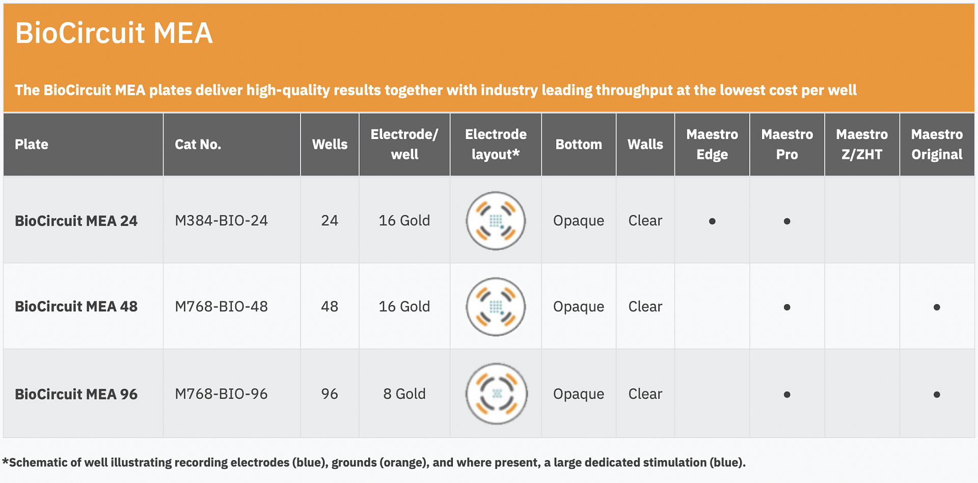 Destičky BioCircuit s mikroelektrodovým polem (MEA) poskytují vysoce kvalitní výsledky. Jedná se o neprůhledné a zároveň o ekonomicky nejvýhodnější MEA destičky. K dispozici jsou formáty 24-, 48- a 96-jamkové destičky. Jsou vybaveny nízkošumovými záznamovými elektrodami, speciálními stimulačními elektrodami (pouze 24- a 48-jamkové verze) a speciálními trychtýřky na destičce, které zjednodušují přípravu destičky.