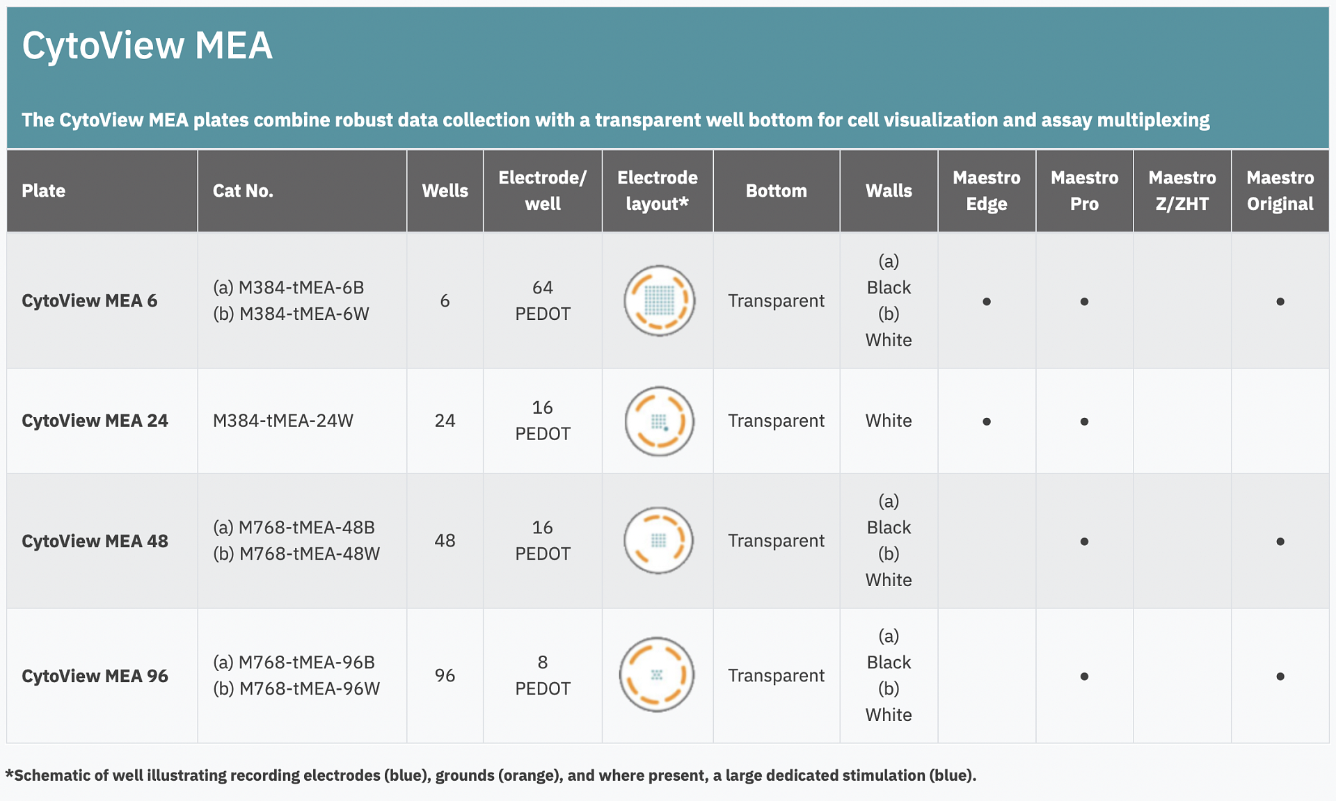 CytoView MEA jsou prémiové vícejamkové destičky s mikroelektrodovým polem (MEA), které přináší jedinečný přístup k informacím o buněčné elektrické síti. Tento typ destiček tenké průhledné dno jamek pro vizualizaci kultury a multiplexování testů. Destičky CytoView MEA jsou černé nebo bílé a jsou k dispozici ve formátech 6, 24, 48 a 96 jamek. Poskytují signály s nízkým šumem a lze je odečítat v průběhu dnů, týdnů nebo měsíců.