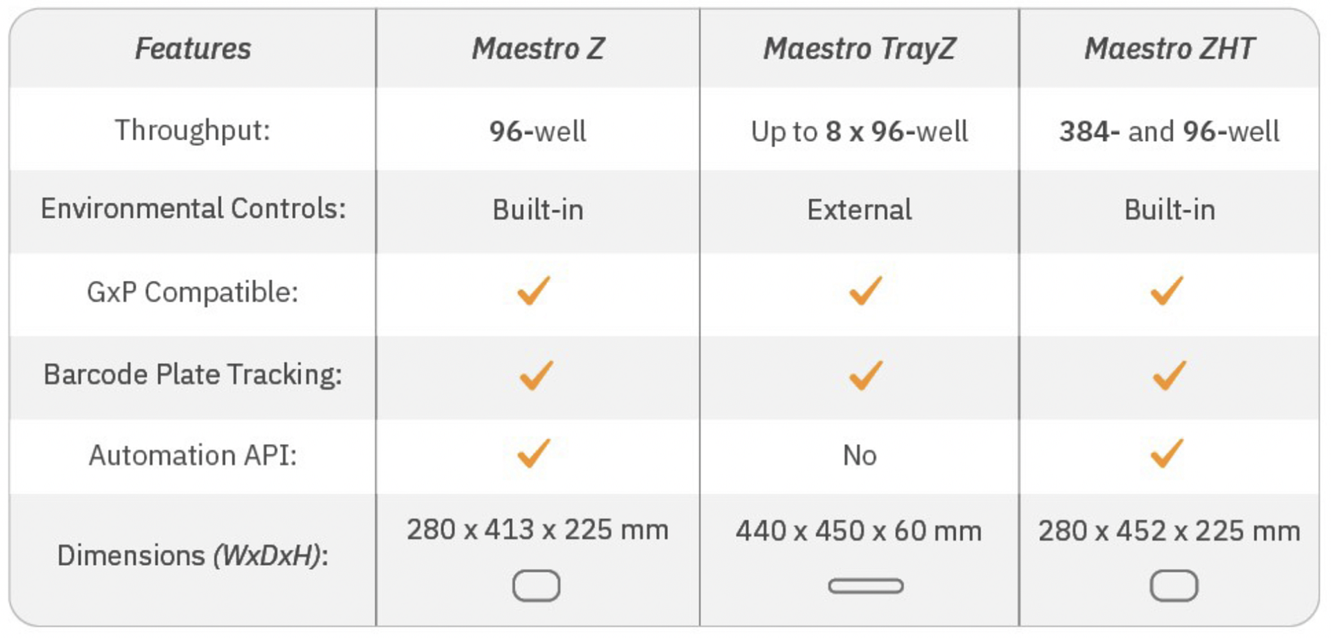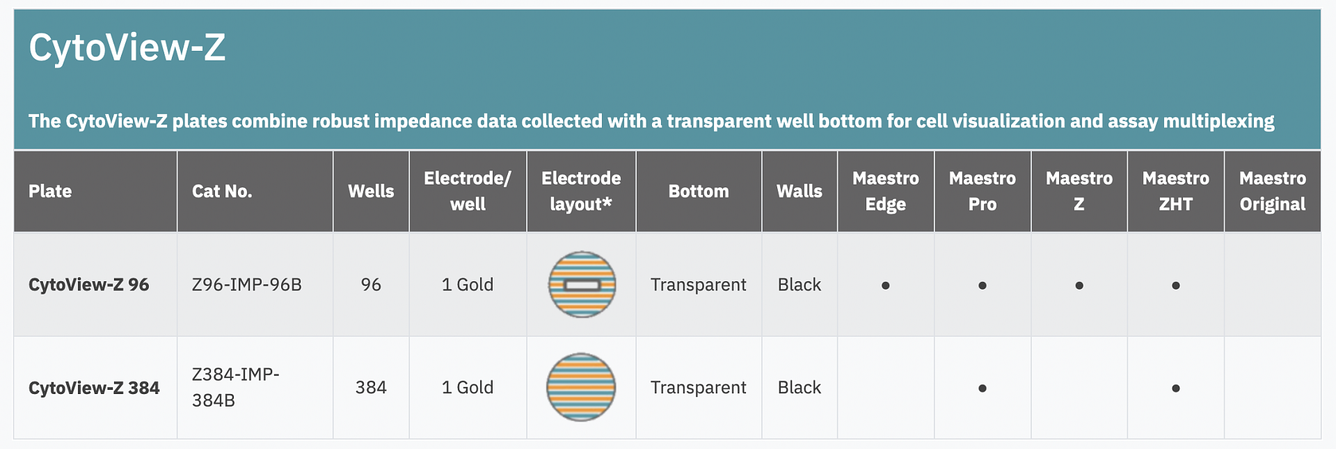 Cytoview-Z se dodávají ve formátech 96- a 384-jamek a jsou kompatibilní s přístroji Maestro Z , Maestro ZHT, 96-jamková destička navíc i s Maestro Edge a Maestro Pro systémy.