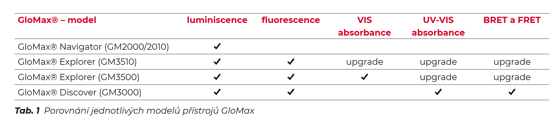 GloMax luminometry od firmy Promega jsou multimode readery s nejcitlivější detekcí luminiscence na trhu. Nízké hodnoty pozadí a celková konstrukce našich přístrojů umožňují velmi citlivé měření reportérových esejí za téměř fyziologických podmínek. Výměnné clonky pro různé typy destiče zajišťují redukci cross-talku v sousedících jamkách. A díky filtrové fluorescenční optice lze velmi snadno provádět multiplexní měření několika parametrů z jedné jamky. Přístroj také disponuje automatickým nastavením gainu, kdy si přístroj automaticky nastavuje tento parametr pro každou jamku zvlášť bez nutnosti zdlouhavého ladění ideální hodnoty pro celou destičku. Výsledkem je ideální citlivost pro celý dynamický rozsah měřených signálů, což zabraňuje saturaci detektoru nebo falešně negativním výsledkům v případě slabých signálů. Readery GloMax jsou dostupné v různých konfiguracích. Základní Navigator disponuje pouze detekcí luminiscence, modely Explorer a Discover pak i detekcí fluorescence a absorbance (viz Tab. 1).