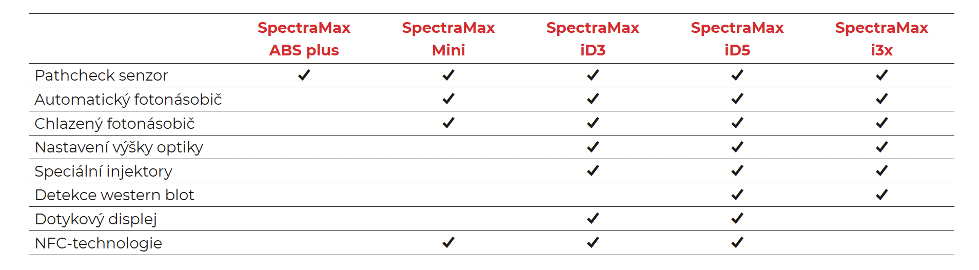 V našem portfoliu naleznete monochromátory, filtrové a hybridní readery. Nezáleží ani na tom zdali hledáte cenově dostupný nebo naopak to nejlepší co trh nabízí. Pokud si nevíte rady a rádi byste se s námi poradili naši specialisté jsou Vám k dispozici a vyberou pro Vás nejvhodnější možnou konfiguraci. Exkluzivně zastupujeme společnosti Molecular Devices a Promega, které jsou pověstné svou spolehlivostí a nízkou poruchovostí. Pokud by však přeci jen došlo k jakékoliv závadě máme vlastní servisní oddělení, které je schopné řešit závady přímo u Vás v laboratoři. Doporučujeme se podívat do tabulky níže, kde si můžete nakonfigurovat reader přesně podle vašich představ.