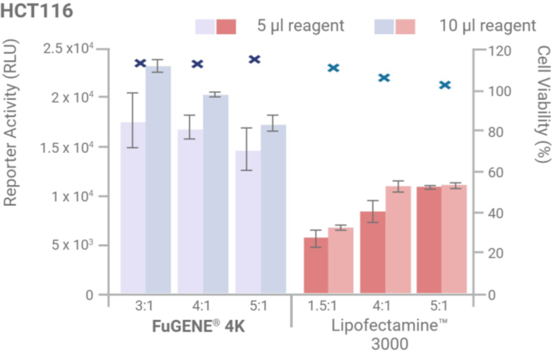 Fugene 4K je nejnovějším přídavkem do rodiny transfekčních činidel pro transfekci DNA. Oproti klasickému HD má vylepšené složení a poskytuje vyšší účinnost přenosu DNA a šetrnost u klasických linií i u náročnějších primárních buněk. Fugene 4K doporučujeme pro ty případy, kde klasický Fugene 6 nebo HD neposkytuje dobré výsledky. Obzvláště vhodný je pro: