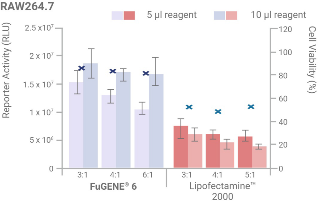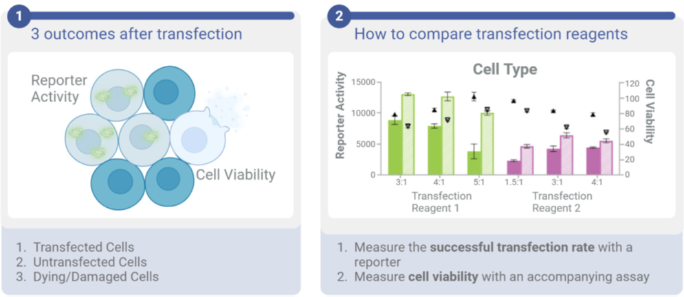 Po samotné transfekci získáte smíšenou kultury, kde jsou zastoupeny úspěšně transfekované viabilní buňky, netransfekované viabilní buňky a poté poškozené umírající buňky. Pro posouzení účinnosti je tedy vhodné použít fluorescenční nebo bioluminiscenční reportér, jako jsou např. fluorescenční proteiny nebo firefly a NanoLuc luciferázy. Čím vyšší bude signál daného reportéru, tím účinnější použitá metoda transfekce. Kromě toho je ale nutné zhodnotit i viabilitu buněk ideálně pomocí komplementární buněčné eseje. Promega nabízí flexibilní řešení pro měření viability, ať už je váš primární výstup jakýkoliv. Pokud používáte fluorescenční proteiny, můžete použít bioluminiscenční esej CellTiter-Glo.V případě, že pracujete s luciferázovými reportéry, můžete viabilitu změřit jednoduše ve stejné jamce pomocí fluorescenční eseje CellTiter-Fluor nebo použít kombinovanou esej ONE-Glo™ + Tox Luciferase Reporter and Cell Viability Assay, která kombinuje CellTiter-Fluor přímo se substrátem pro firefly luciferázu.