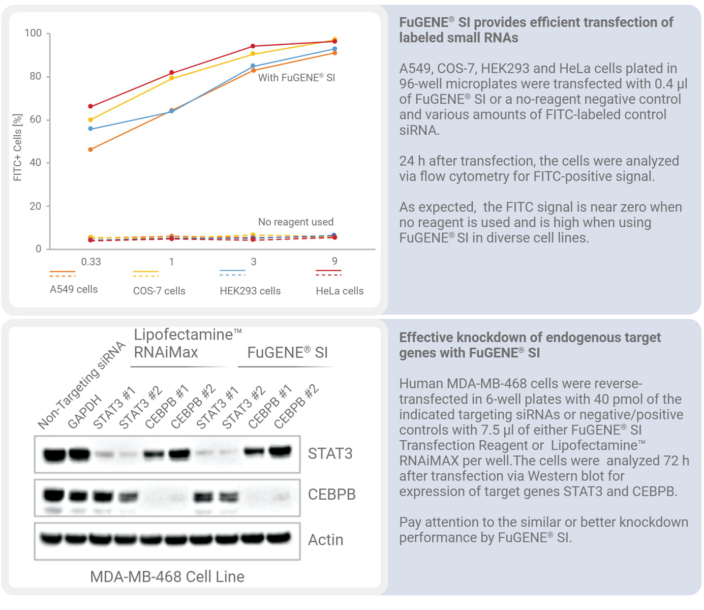 Fugene SI je 100% syntetické transfekční činidlo s velmi nízkou toxicitou určené pro transfekci siRNA, miRNA a další malých RNA do široké škály eukaryotických buněk. Je obzvláště vhodný pro výzkumníky, kteří hledají maximální účinnost knockdownu pomocí siRNA s minimální vlivem na buňky.