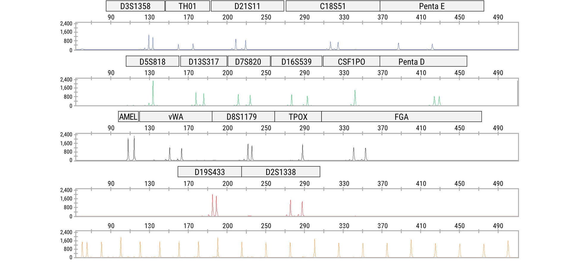 STR multiplex pro testování paternity a pro vzorky do databází, okamžitá amplifikace z FTA® karet, amplifikace do 1.5 hodiny, společná amplifikace lokusů: D2S1338, D19S433, Penta D, Penta E, Amelogenin a 13 lokusů CODIS