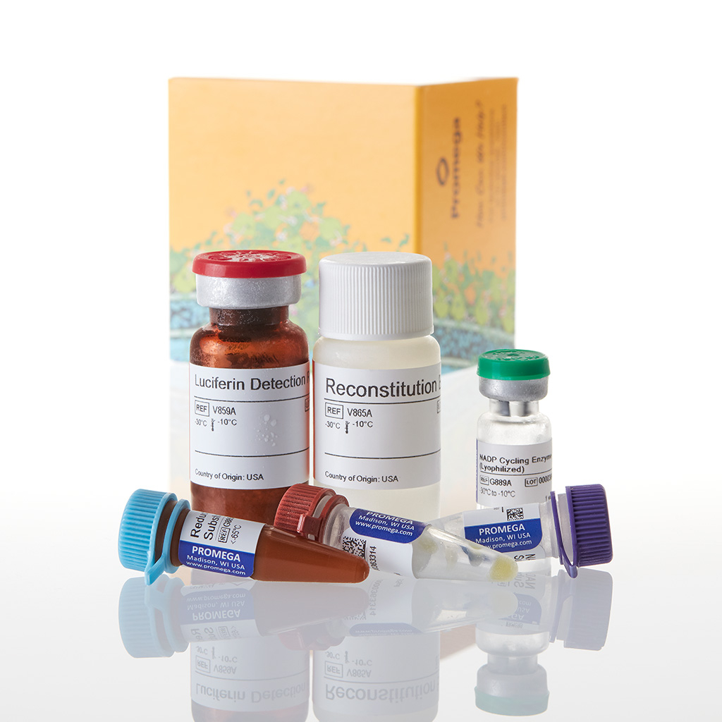 NADP+/NADPH-Glo Assay je jednoduchá bioluminiscenční lytická esej pro stanovení celkového obsahu redukované a oxidované formy NADP. Esej je založená na redukci proluciferinového substrátu pomocí NADPH-dependentní reduktázy. V prvním kroku je oxidovaná forma NADP+ převedena pomocí cyklovacího enzymu na NADPH. V přítomnosti NADPH je pak proluciferin reduktázou redukován na luciferin, který je následně oxidován Ultra-Glo rekombinantní luciferázou a generuje se bioluminiscence úměrná množství NADH. Pomocí modifikovaného protokolu lze stanovit samostatně i oxidovanou a redukovanou formu kofaktoru. Jednotlivé formy se selektivně inaktivují krátkým zahřátím v kyselém nebo bazickém pH a následně se stanoví každá forma samostatně.
