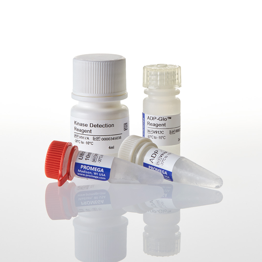 ADP-Glo Kinase Assay měří množství ADP, které vzniká při kinázové reakci. Esej je vhodná pro měření účinku chemických látek na aktivitu purifikovaných enzymů a je ideální jak pro primární screening tak pro profilování selektivity. Samotné stanovení probíhá ve dvou krocích. Sledovaný enzym je nejprve inkubován se známým množstvím ATP a substrátem. Přidáním prvního reagentu je reakce zastavena a zbývající ATP vyčerpáno. Následně se přidá druhý reagent, který konvertuje vzniklé ADP zpět na ATP a navíc obsahuje firefly luciferázu s luciferinem. Ta spotřebovává ATP a generuje signál úměrný aktivitě sledované kinázy.