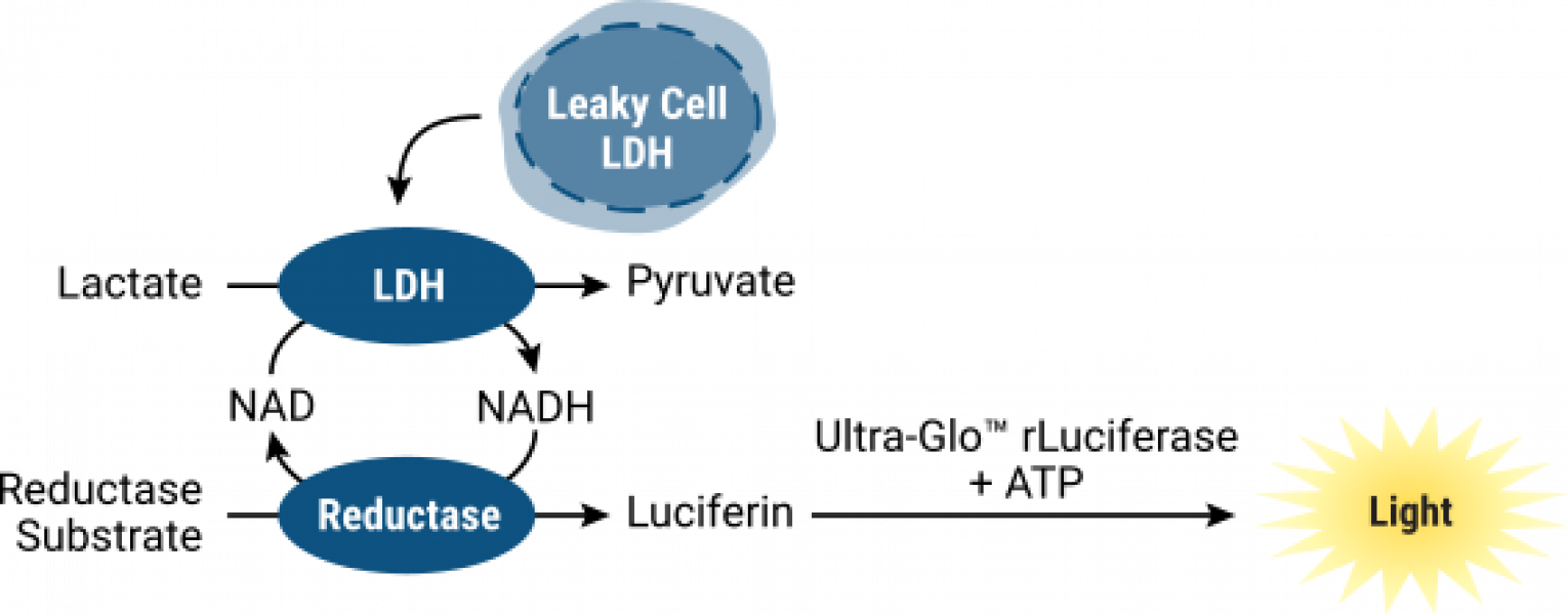 LDH-Glo je bioluminiscenční esej pro sledování cytotoxického působení látek. Je založená na detekci laktát dehydrogenázy (LDH), která je uvolňována z buněk s narušenou cytoplazmatickou membránou. Uvolněná LDH oxiduje laktát obsažený v médiu za redukce NAD+ na NADH. NADH je pak využito ve spřažené enzymové reakci enzymem reduktázou, která proton převádí na proluciferin a přemění ho na luciferin. Luciferin je pak v posledním kroku oxidován Ultra-Glo luciferázou a generuje se bioluminiscence úměrná množství LDH uvolněné do média.