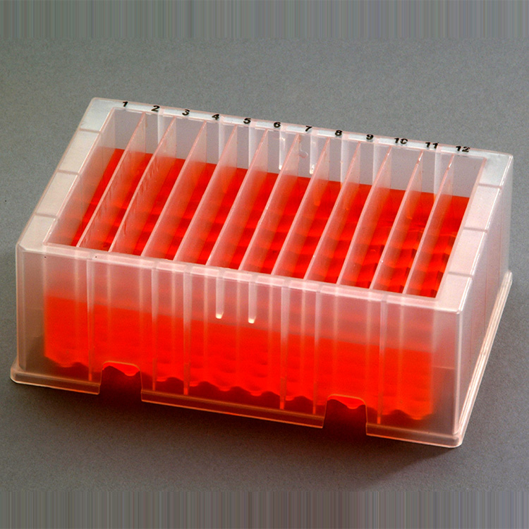 Dvanáctikanálové rezervoáry z odolného polypropylenu. Přesné rozměry jsou 127,76 mm x 85,85 mm. Kanály jsou číslované, kapacita kanálu je 22 ml. Základna každého kanálu má 8 pyramidových prohlubní pro minimalizaci mrtvého objemu. Rezervoáry jsou nesterilní a v balení po 5 kusech.