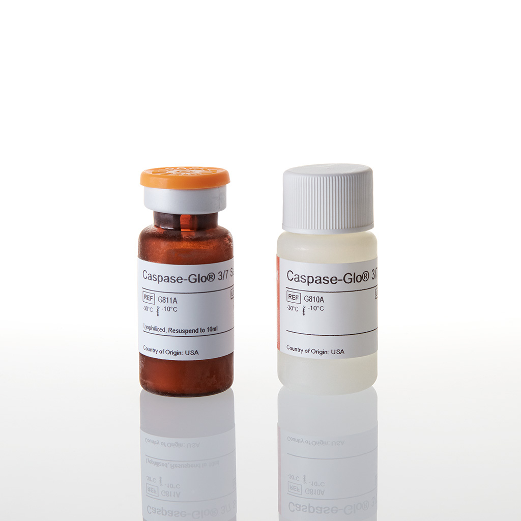 Caspase-Glo 3/7 je jednokroková lytická bioluminiscenční esej založená na specifickém štěpení luciferázového prosubstrátu Z-DEVD-aminoluciferinu aktivní kaspázou 3 a 7. Po přidání činidla přímo k buňkám, dojde k jejich lyzi a štěpení prosubstrátu. Uvolněný aminoluciferin je následně oxidován termostabilní luciferázou a generuje se stabilní luminiscenční signál úměrný množství aktivní kaspázy ve vzorku.