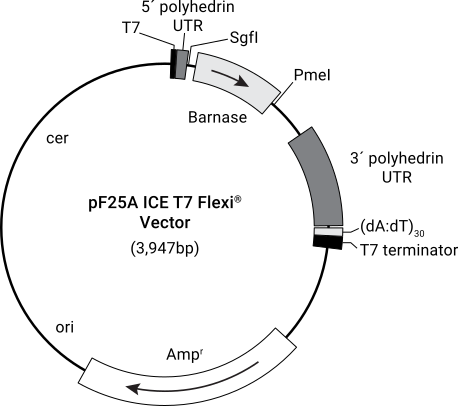 pF25A ICE T7 Flexi® Vector byl navržen pro použití s hmyzími buněčnými extrakty a obsahuje sekvenci s nepřekládanými (UTR) oblastmi na 5‘ a 3‘ konci oblasti kódující gen pro zvýšenou účinnost translace. U vektoru stačí jednoduše naklonovat váš ORF a přenést insert do Flexi vektoru. Flexi vektory obsahují smrtící barnázový gen, který je obklopený restrikčními místy pro dvě vzácné restriktázy SgfI a PmeI. Při transferu dojde k vystřižení barnázového genu a připojení požadovaného insertu. Pokud je transfer sekvence neúspěšný, exprimovaná barnáza tyto kolonie eliminuje. Tento vektor je určený pro selekci kolonií pomocí ampicillinu.