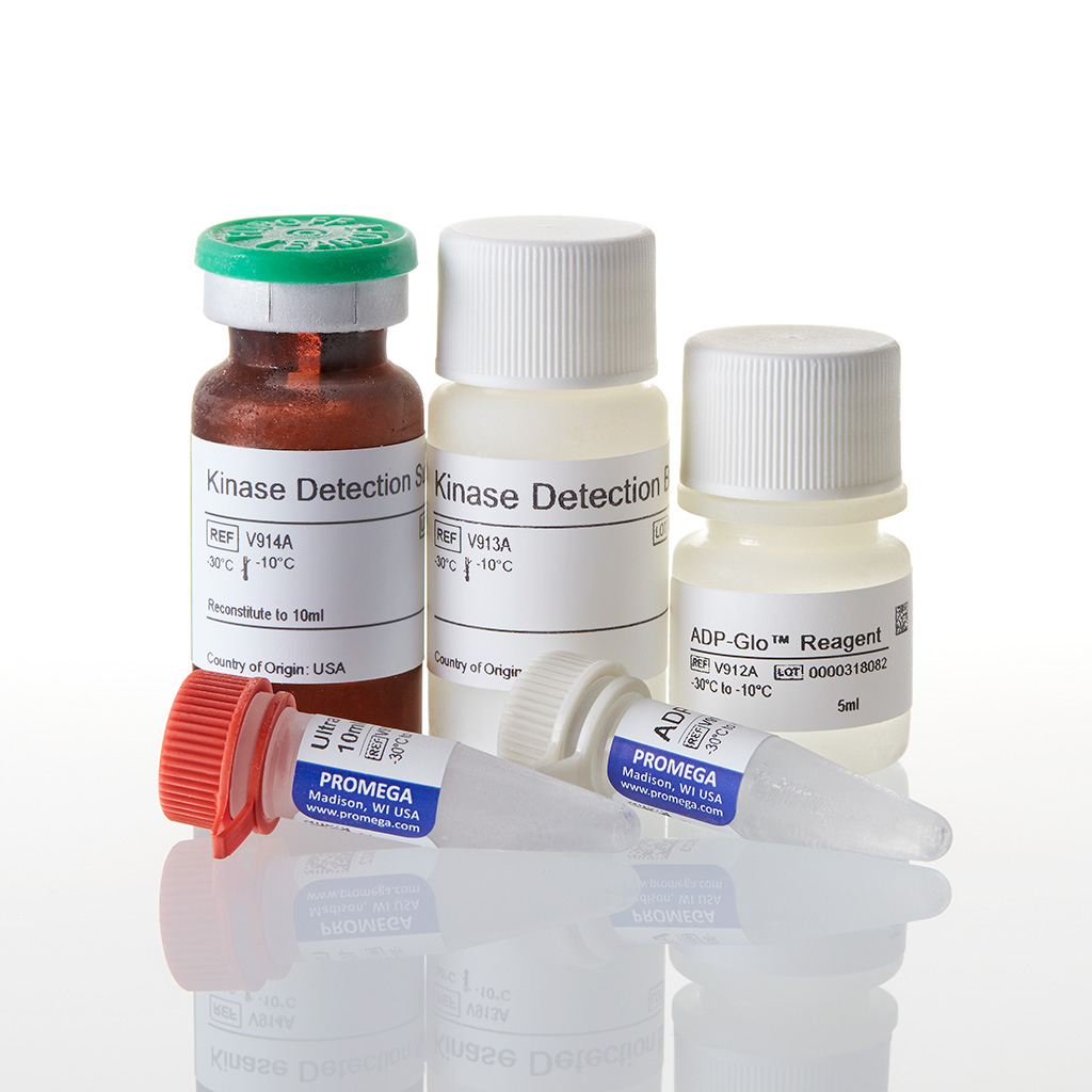 ADP-Glo Kinase Assay měří množství ADP, které vzniká při kinázové reakci. Esej je vhodná pro měření účinku chemických látek na aktivitu purifikovaných enzymů a je ideální jak pro primární screening tak pro profilování selektivity. Samotné stanovení probíhá ve dvou krocích. Sledovaný enzym je nejprve inkubován se známým množstvím ATP a substrátem. Přidáním prvního reagentu je reakce zastavena a zbývající ATP vyčerpáno. Následně se přidá druhý reagent, který konvertuje vzniklé ADP zpět na ATP a navíc obsahuje firefly luciferázu s luciferinem. Ta spotřebovává ATP a generuje signál úměrný aktivitě sledované kinázy.
