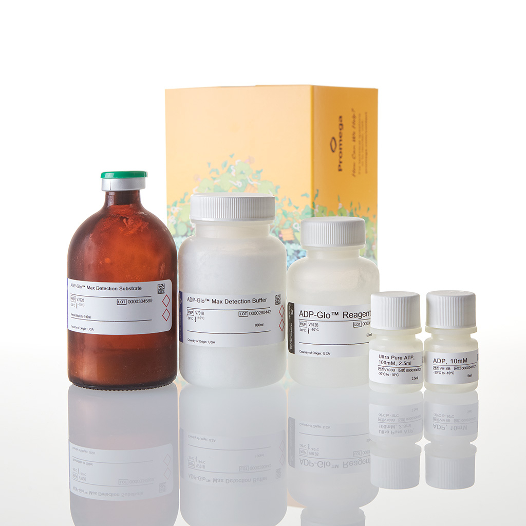 ADP-Glo Max Assay je luminiscenční esej pro měření aktivity kináz a ATPáz, která je založená na kvantifikaci ADP vznikajícího při reakci. Esej je vhodná pro sledování aktivity prakticky jakéhokoliv enzymu, který generuje ADP, kdy jsou potřeba vyšší koncentrace ATP (až do 5 mM). ADP-Glo Max produkuje silný luminiscenční signál, který dobře koreluje s aktivitou enzymu, a lze použít v různých typech mikrodestiček. Samotné stanovení probíhá ve dvou krocích. Sledovaná kináza je nejprve inkubována se známým množstvím ATP a substrátem. Přidáním prvního reagentu je reakce zastavena a zbývající ATP vyčerpáno. Následně se přidá druhý reagent, který konvertuje vzniklé ADP zpět na ATP a navíc obsahuje firefly luciferázu s luciferinem. Ta spotřebovává ATP a generuje signál úměrný aktivitě sledovaného enzymu.