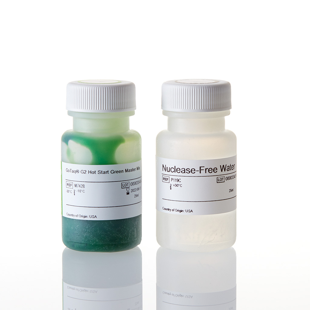 GoTaq G2 Hot Start Green Master Mix je připravený mix pro endpoint hot start PCR s detekcí pomocí elektroforézy v agarózovém gelu. Green Master Mix obsahuje GoTaq G2 DNA polymerázu s 5‘ → 3‘ exonukleázovou aktivitou, dNTP, MgCl2 a reakční pufr, vše v optimálních koncentracích pro efektivní amplifikaci širokého spektra DNA templátů. Na DNA polymerázu je navázána protilátka, která blokuje její aktivitu při teplotě do 70 °C, což minimalizuje tvorbu nespecifických produktů a dimerů primerů. Její aktivita je obnovena po zahřátí reakce na 94-95 °C po dobu 2 min při prvotním denaturačním kroku. Master Mix má dostatečnou hustotu pro přímé nanášení na gel a navíc obsahuje žluté a modré barvivo pro indikaci průběhu elektroforetické separace. Není vhodný pro aplikace s následným asborbančním nebo fluorescenčním měřením, protože obsažená barviva mohou interferovat.