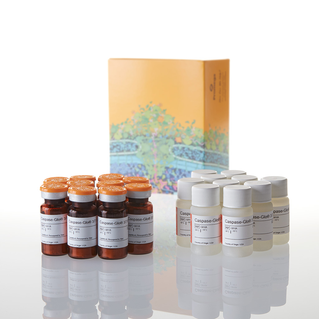 Caspase-Glo 3/7 je jednokroková lytická bioluminiscenční esej založená na specifickém štěpení luciferázového prosubstrátu Z-DEVD-aminoluciferinu aktivní kaspázou 3 a 7. Po přidání činidla přímo k buňkám, dojde k jejich lyzi a štěpení prosubstrátu. Uvolněný aminoluciferin je následně oxidován termostabilní luciferázou a generuje se stabilní luminiscenční signál úměrný množství aktivní kaspázy ve vzorku.