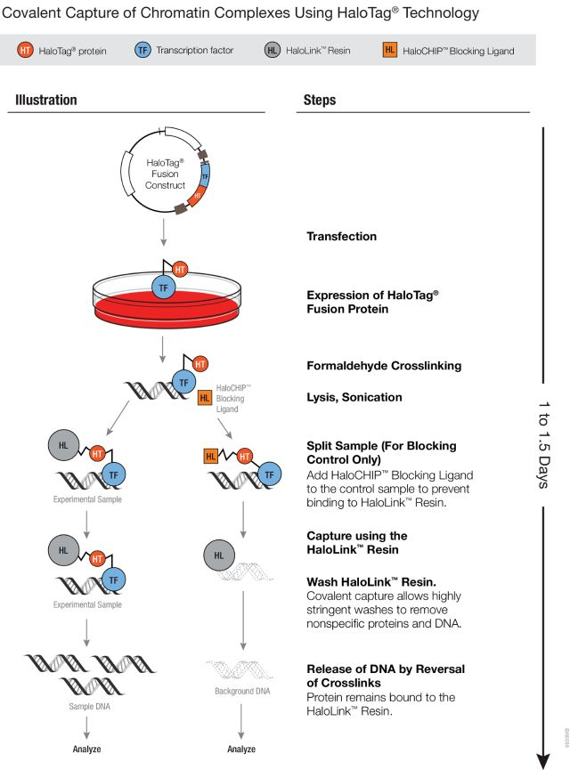 HaloCHIP Systém je novou metodou pro kovalentní záchyt intracelulárních protein:DNA komplexů bez použití protilátek, která představuje účinnou a robustní alternativu ke standardním chromatinovým imunoprecipitacím (CHIP assays). Sledovaný protein je v buňce exprimován jako HaloTag fúzní protein, následně je zesíťován s DNA pomocí formaldehydu a zachycen na HaloLink pryskyřici. Ta s HaloTagem rychle tvoří vysoce specifickou kovalentní vazbu, což umožňuje důkladné promývání a odstranění balastních proteinů a DNA. Zahřátím se pak rozruší vazba mezi fúzním proteinem a fragmentem DNA, který lze dále purifikovat a analyzovat. Oproti klasickým CHIP esejím lze s HaloCHIP technologií získat výsledky už za 24-48 hodin a protokol vyžaduje méně kroků. Vyšší poměr signál/šum umožňuje detekci i malých změn vazby proteinu na DNA z velmi malého počtu buněk.