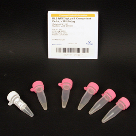 BL21(DE3)pLysS Competent Cells allow high-efficiency protein expression of any gene that is under the control of a T7 promoter and has a ribosome binding site. BL21(DE3)pLysS is lysogenic for λ-DE3, which contains the T7 bacteriophage gene I, encoding T7 RNA polymerase under the control of the lac UV5 promoter. BL21(DE3)pLysS also contains a plasmid, pLysS, which carries the gene encoding T7 lysozyme. T7 lysozyme lowers the background expression level of target genes under the control of the T7 promoter but does not interfere with the level of expression achieved following induction by IPTG. For researchers performing more than one transformation, competent cells are available in standard format (200µl aliquots). For added convenience, single-use competent cells (50µl aliquots) also are available.